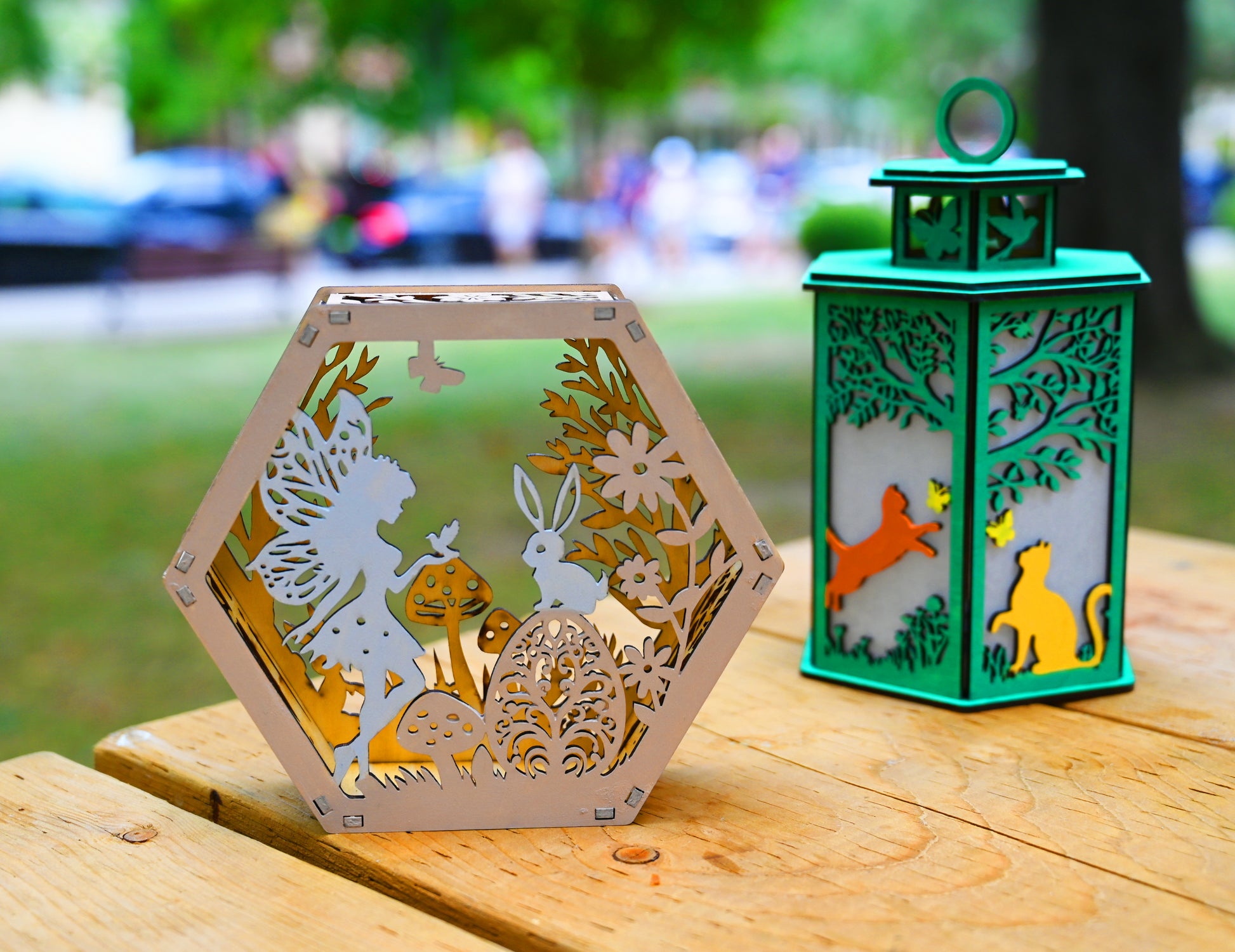 - Materials: wood, paper, acrylic, rechargeable LED Electronic Devices